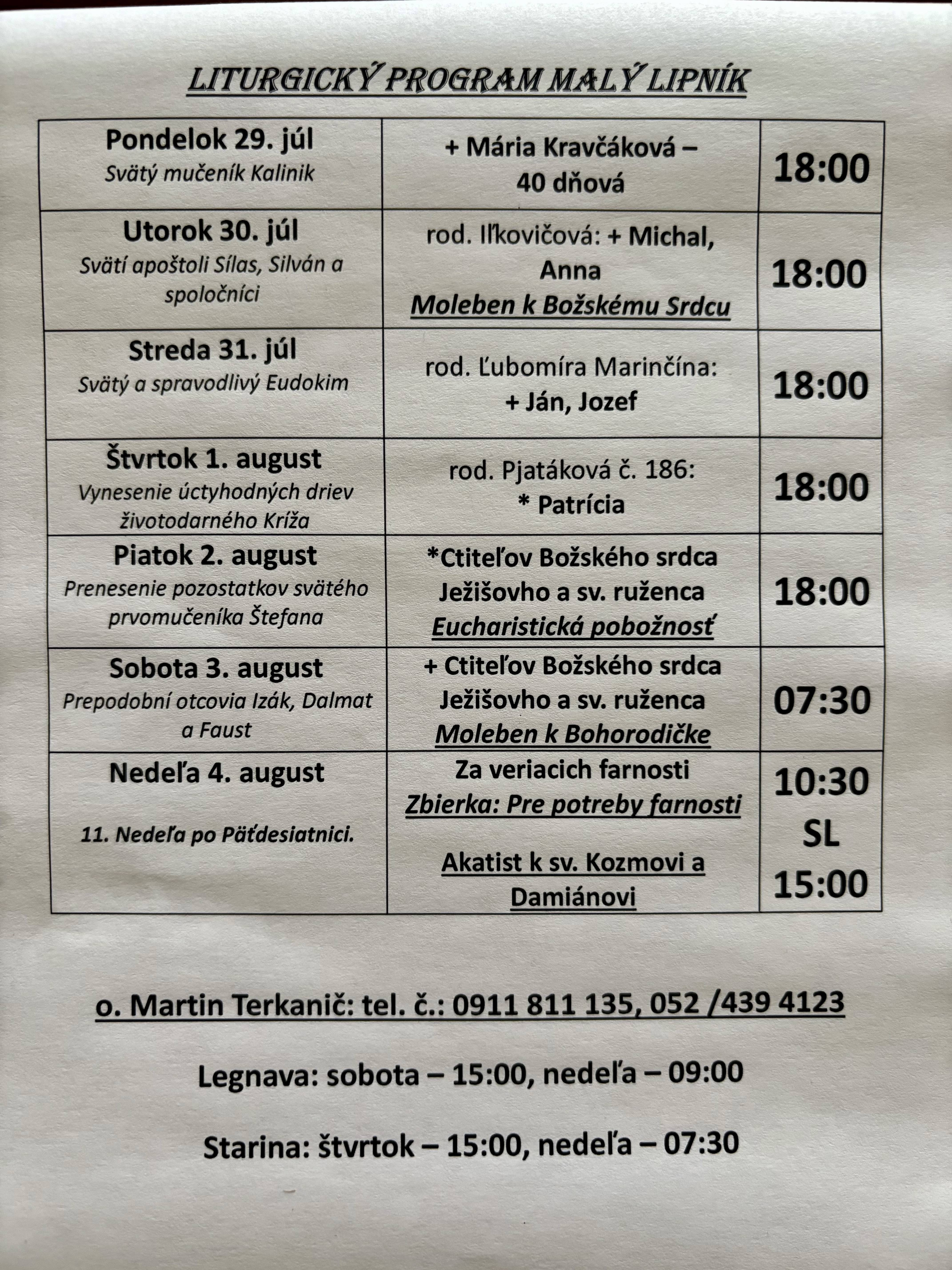 Liturgický program 29.07. - 04.08.2024